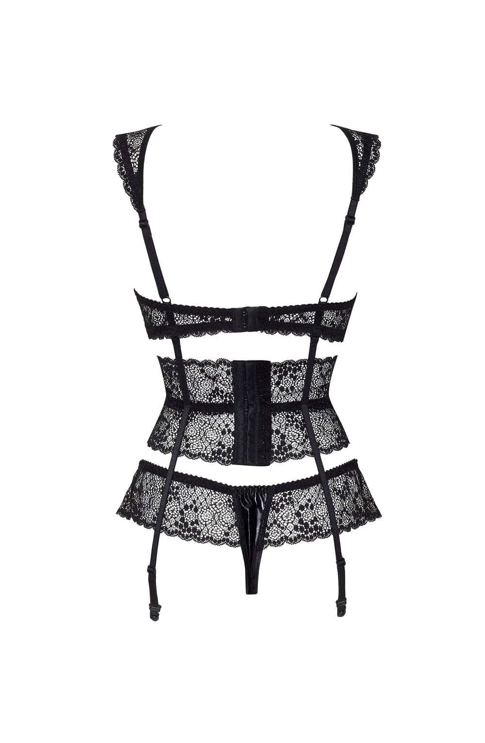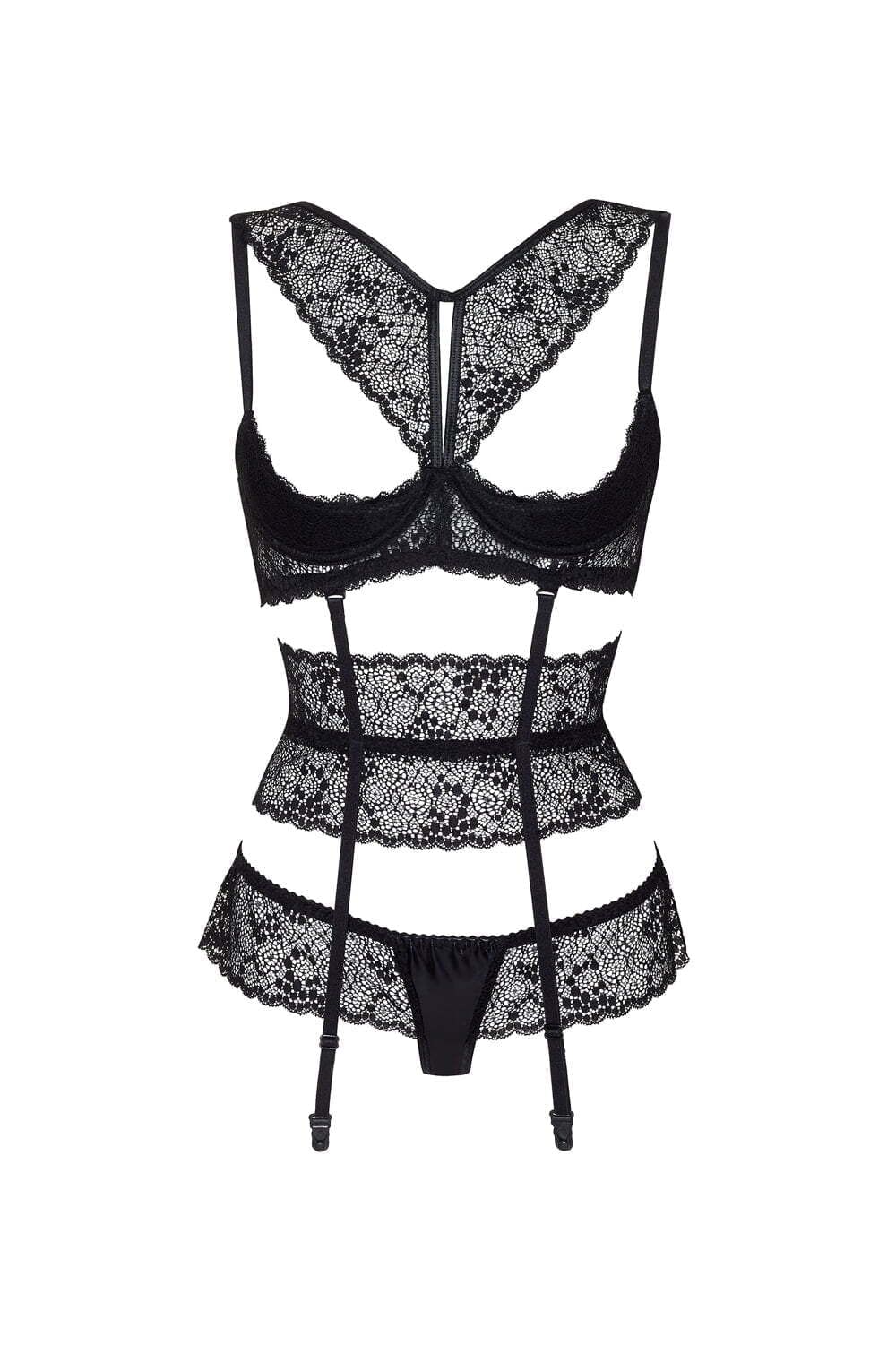 A wonderfully different lingerie design, Lillie offers a open bra style, waist suspender and thong set in beautiful soft lace.  Item arrives packaged in a Beauty Night box. Please note the nipple coves and stockings are not included but are available separately.