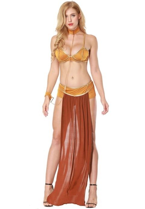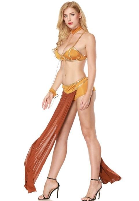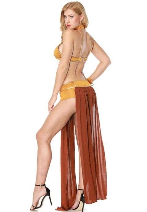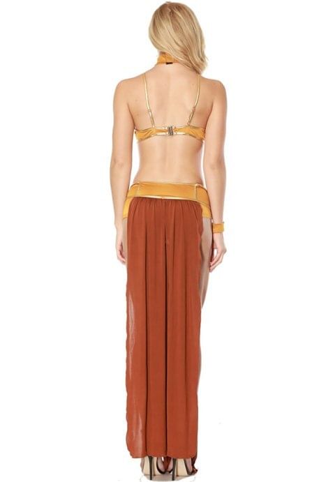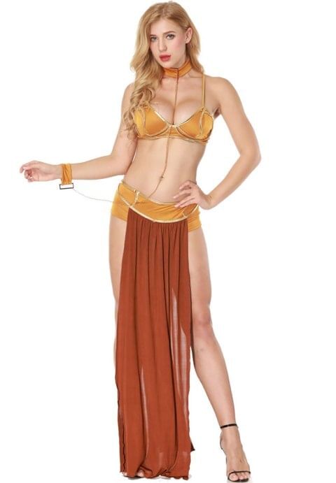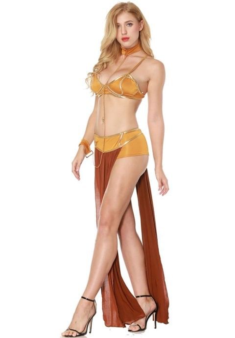 All hail the queen! Have them all falling at your feet in this Follow The Ruler costume featuring a gold bra top, a matching cheeky panty, a long skirt, and a choker with cuffs.
