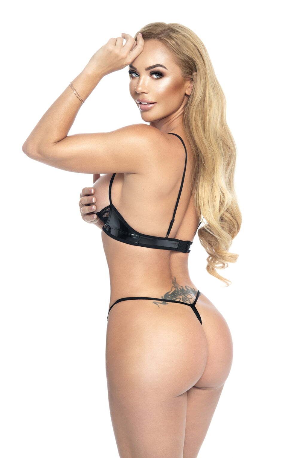 Extremely erotic set made of the highest quality wet look fabric combined with delicate lace. “Open” bodice, fastened at the back with double-breasted hooks. Thin, adjustable straps. “Open” thong decorated at the front, similarly to the bra, with a small flower with a diamante in the middle.Bira arrives packaged in her own box making this design ideal as a treat or gift.
