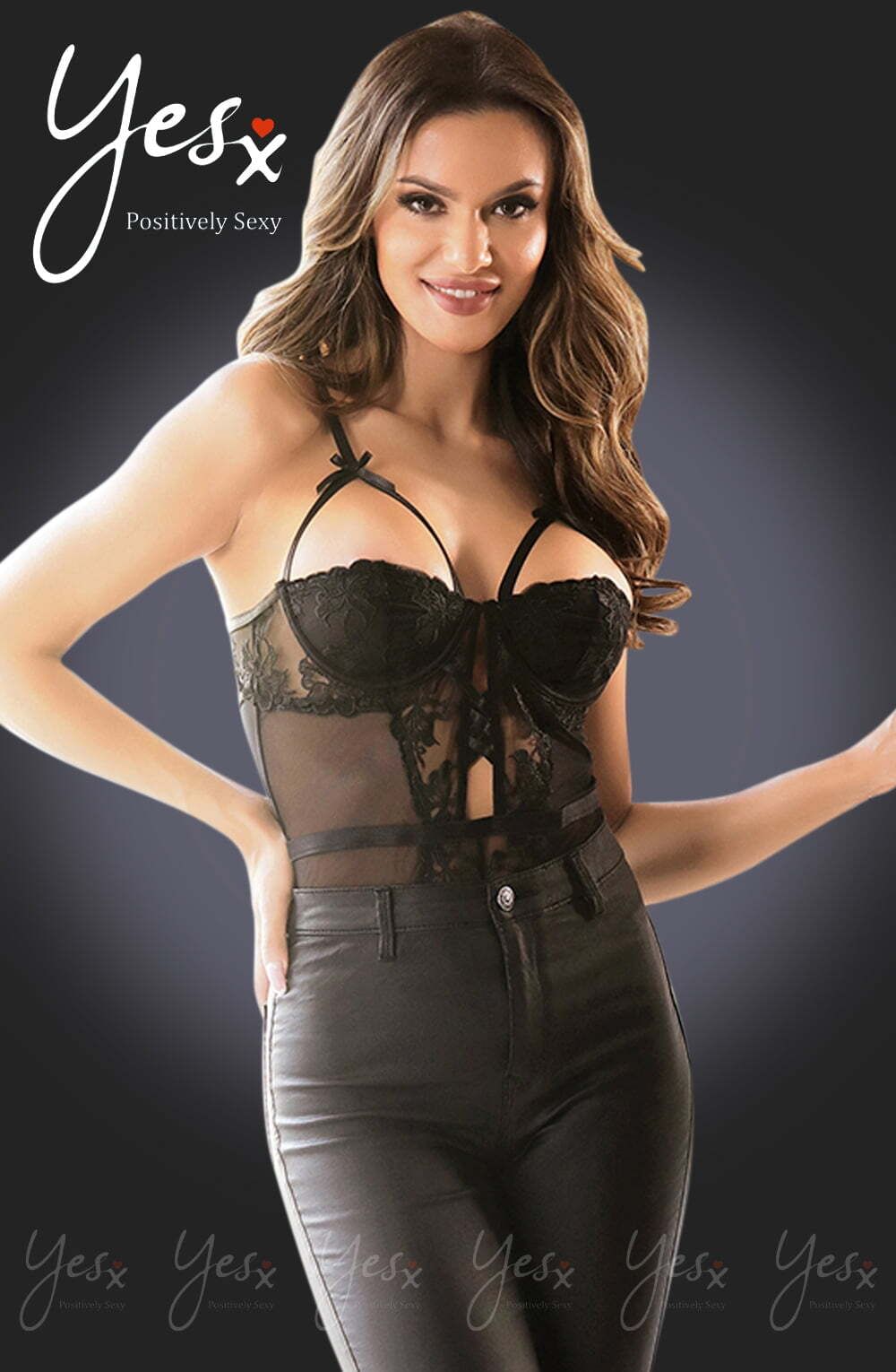 Stunning mesh body suit with elegant lace detailing and pretty bows. Make this gorgeous bodysuit your perfect evening look by pairing it with either your favourite jeans or hold ups.This item arrives packaged in a YesX satin bag.